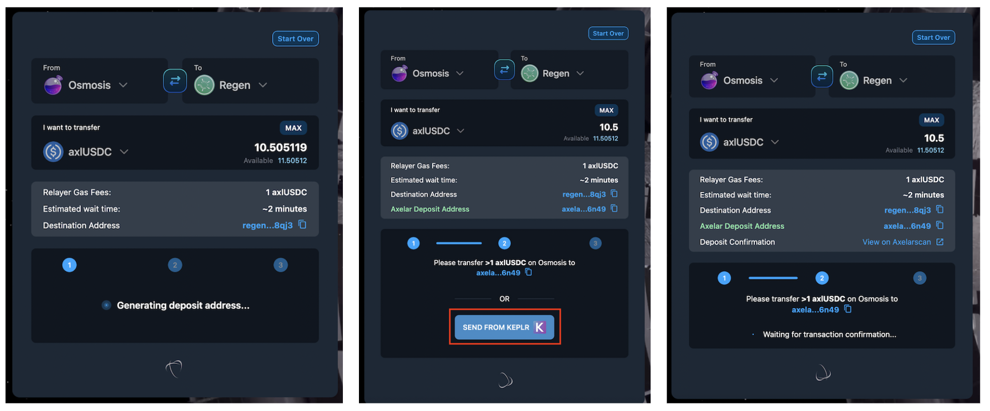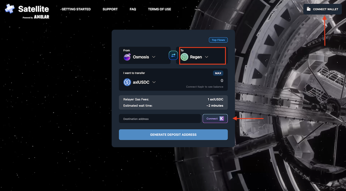 This guide provides directions for bridging USDC from your Osmosis wallet to your Regen wallet through the [satellite.money](http://satellite.money/) UI.&#x20;