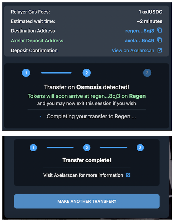 **Congratulations! You have now bridged USDC to your Regen wallet, where it is ready to invest in your favorite Regen Marketplace project.**&#x20;