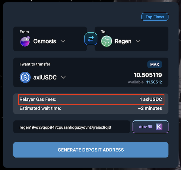 a. Input how much USDC you want to transfer. The "Max" button fill this field will all available axlUSDC. *Note: Relayer Gas Fees will come out of the amount set here. You do not need to exclude a reserve amount of USDC for gas fees.*&#x20;