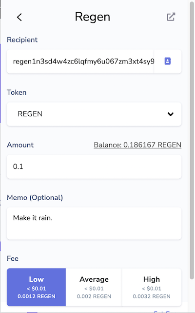 b. Enter the correct wallet address in the "Wallet Address" field and the amount you are moving in the "Amount" field. The "Memo" field is optional for transfers between Regen wallets, but can be used for any transaction notes.